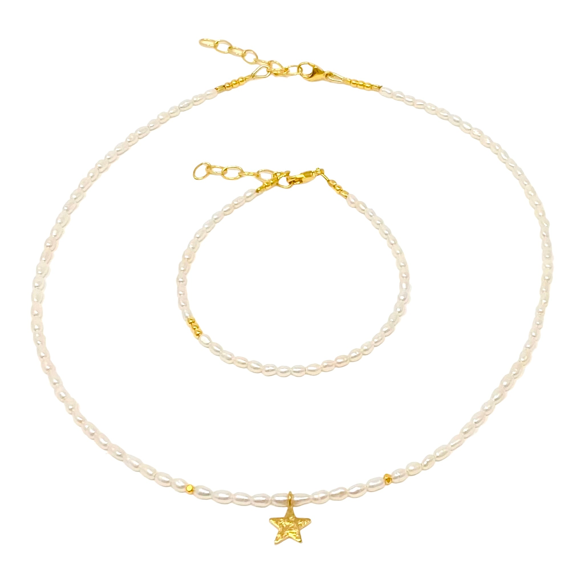 This jewellery set features my bestselling seed freshwater pearl choker necklace and bracelet made with the same gorgeous grade AAA freshwater pearls. I handcraft these designs with meticulous care to detail and the setting of the pearls.