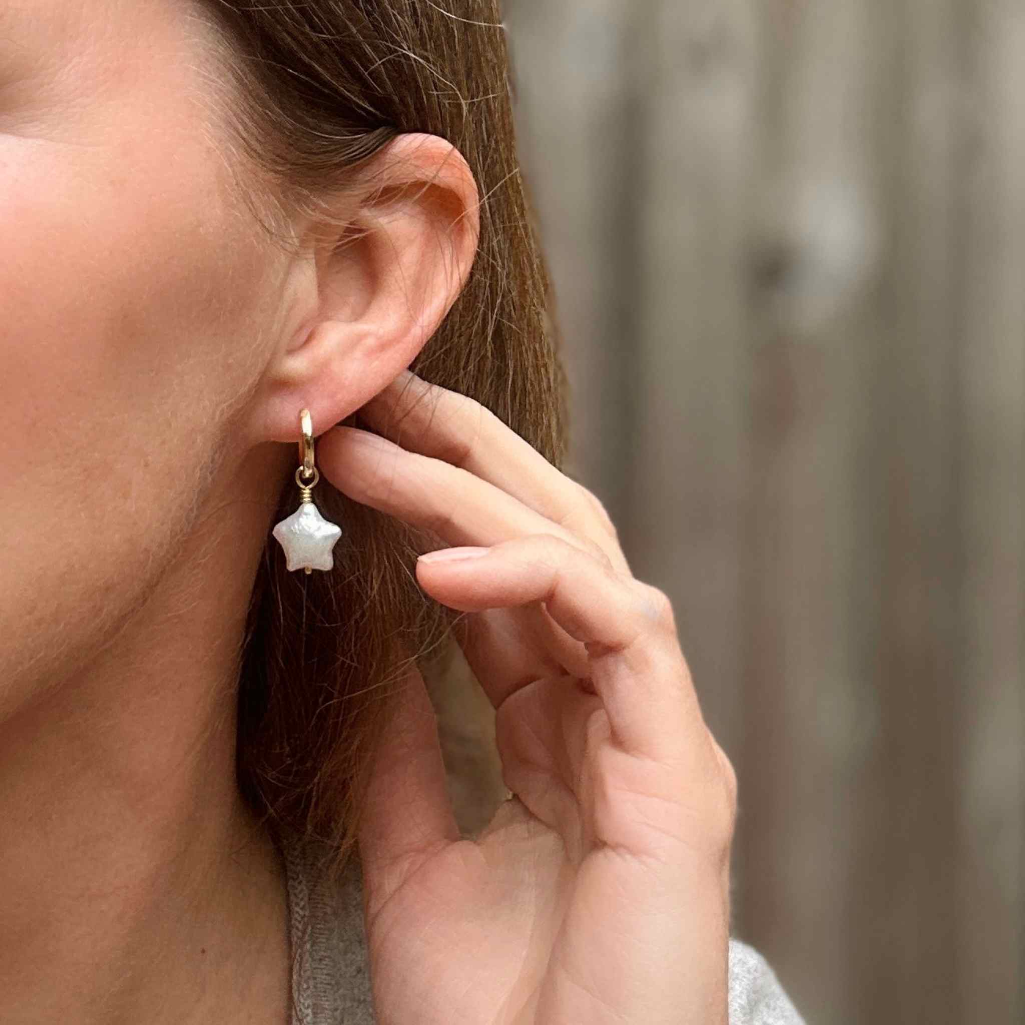 Gorgeous gold huggies with star pearls. Now in new design with a slightly bigger hoops but with the same stunning star pearls with the most stunning metallic lustre. The perfect gift for your daughter or yourself.