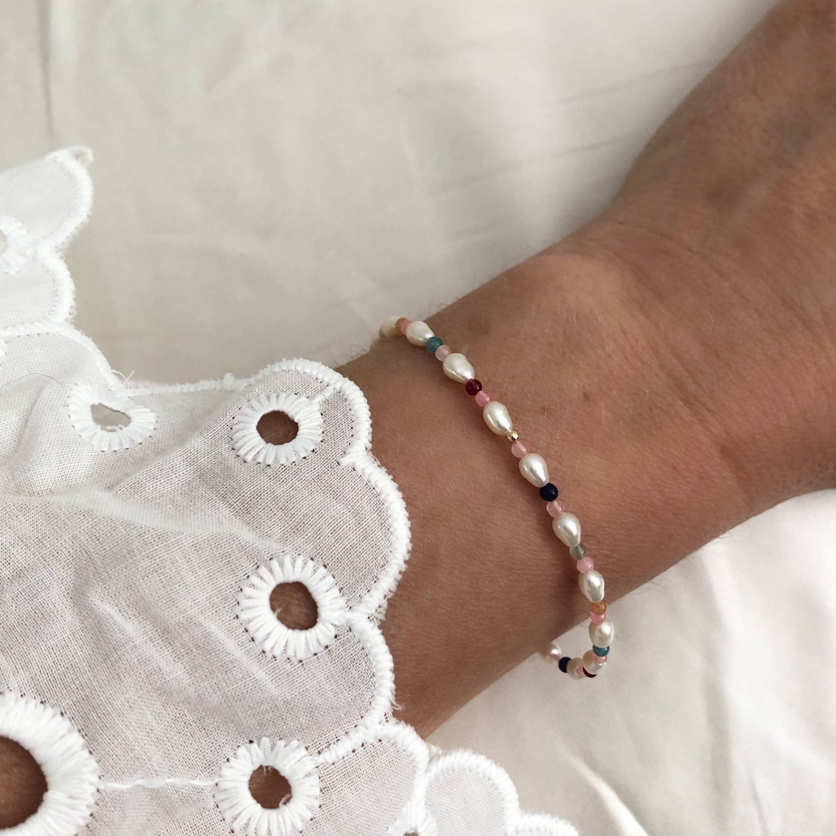 This Boho Girly Pearl Bracelet is your cute, feminine and fun pearl bracelet design, featuring gorgeous cultured freshwater pearls set against small coloured gemstones. These funky little rice shaped freshwater pearls have a gorgeous lustre, as they are cultured in nature do expect small variations from the picture.